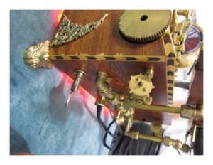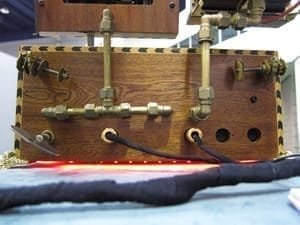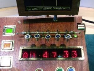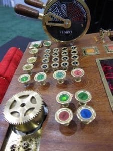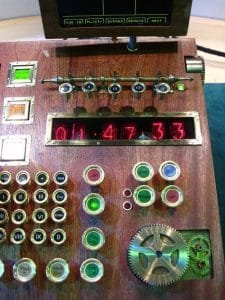 The 1of1Stuff team’s first project in 20210. The Comptometer, a Steampunk-styled console which, so the backstory goes, gives access to 1930s broadcast footage. The controller is full of nixie tubes, brass buttons and analogue dials, and a “test calibration” system made up of tiny clinking hammers.