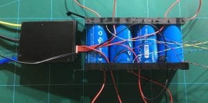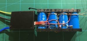 I built each set of batteries the same, following the schematic diagram. What isn’t shown in the pictures is how the battery tabs are joined together. I used solder, being careful not to leave the heat on the tab for too long. I also used hot melt glue to “tack” the cables in place before “folding” the BMS over the batteries. There is a thermal probe on the BMS I pushed this between two of the batteries; you can just see this in the photo, it’s the black wire.